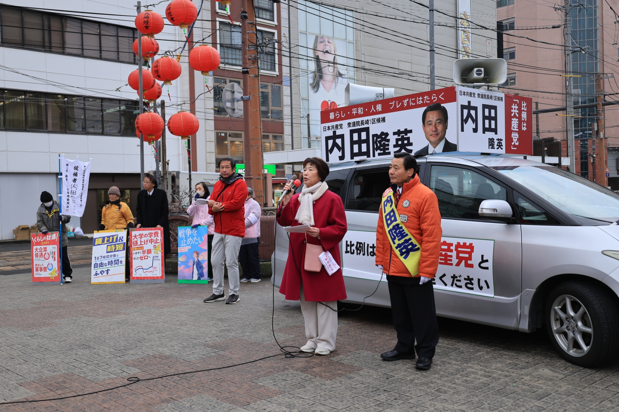 内田候補は、力強く第一声。終日長崎市内で訴えました。